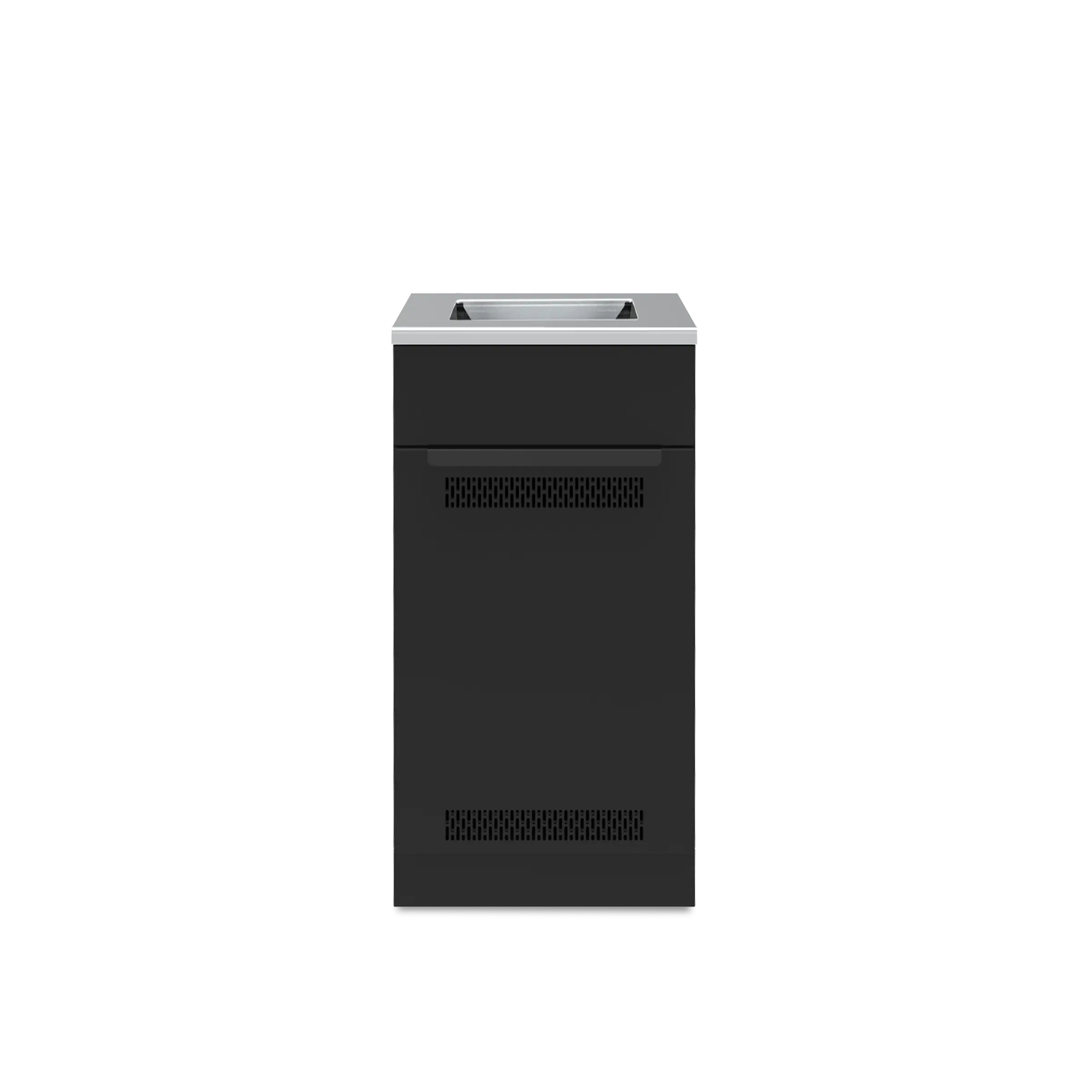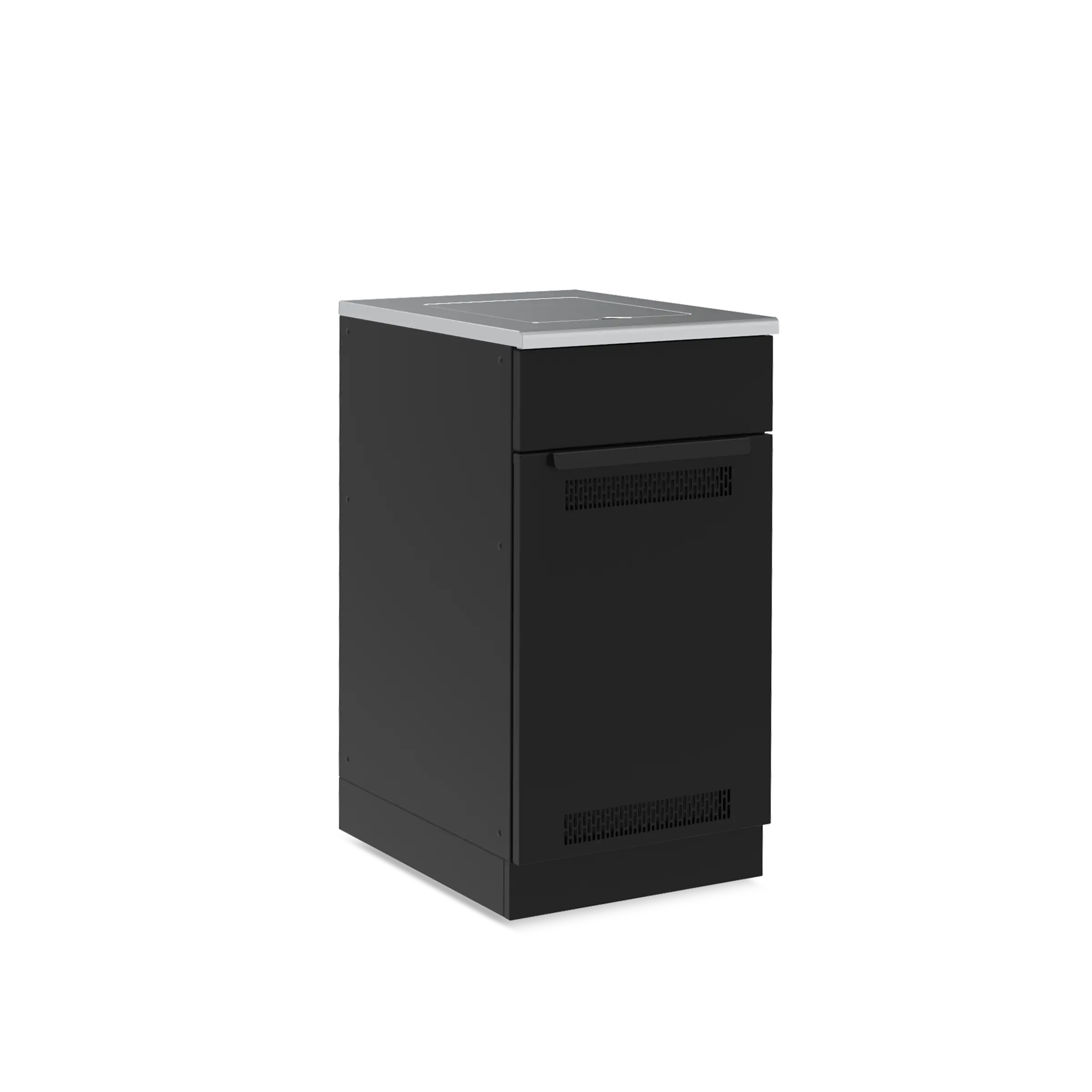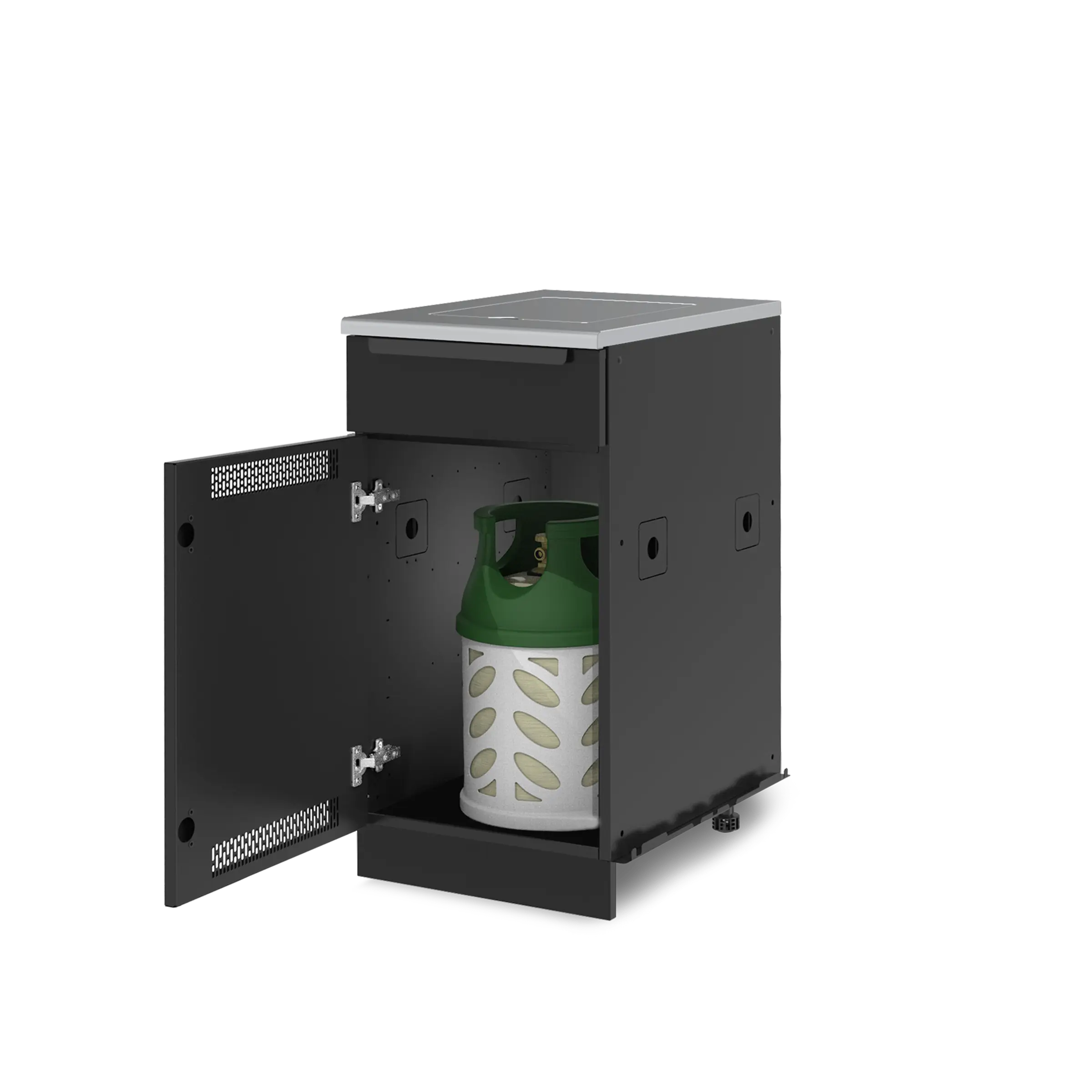 Modularni ormarić za vanjsku kuhinju od crno lakiranog pocinčanog čelika, opremljen ventiliranim vratima i izvlačnom ladicom. Uključuje radnu ploču od nehrđajućeg čelika 430 s izrezom za bočni plamenik. Unutrašnjost nudi prostor za pohranu plinske boce ili druge opreme.